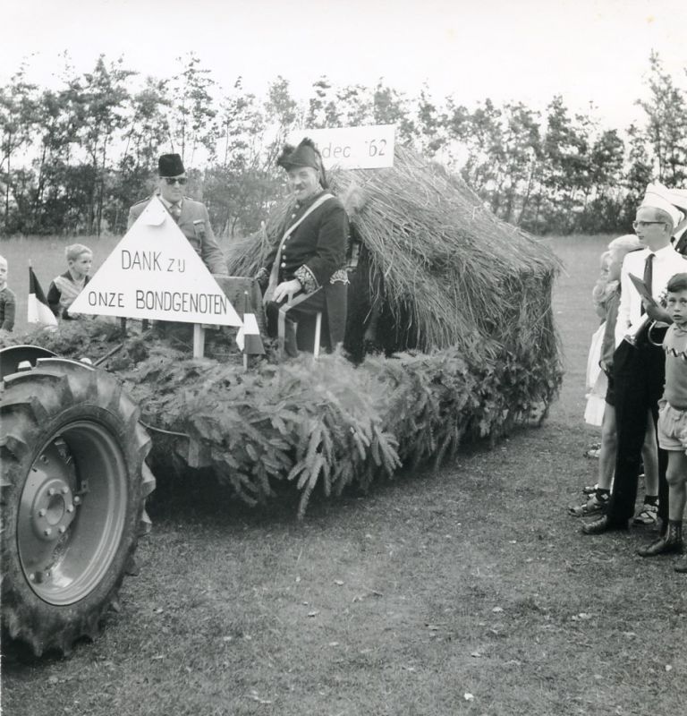 Dizze foto út 1963 snijt in dan tige tear ûnderwerp oan. Nij Guinea is yn 1962 ûnder druk fan de grutmachten oan Indonesië ferkwânsele. De Papoea ’s waarden oan harren lot oerlitten en smid Jaap Bosgra as Soekarno en slachter Durk ten Dam, yn it ambtskostúm fan in foaroarlochske premier as fertsjintwurdiger fan Nederlân represintearje de oerdracht op in feestwein.