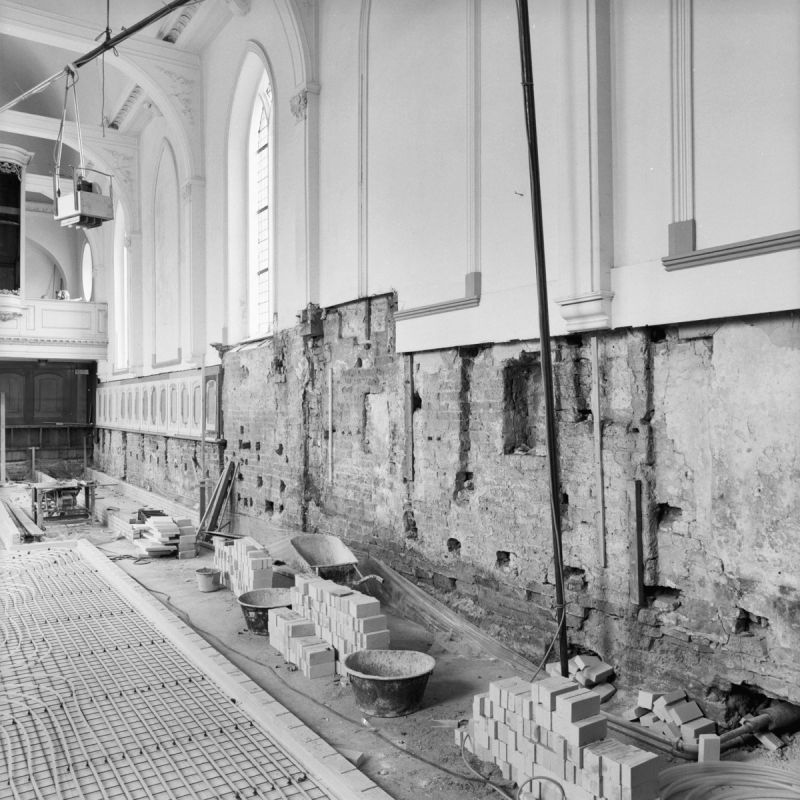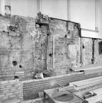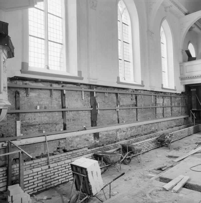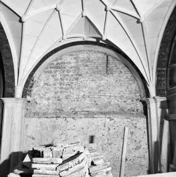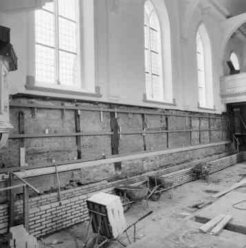 De lambrisering is voor de muur aan de zuidkant weggehaald; links is de preeksto