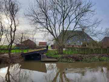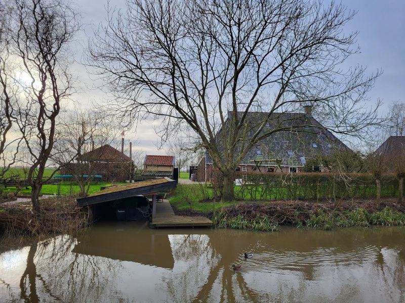 Links Skippersbuorren 19, rechts Sjaardaleane 19. Gescheiden door het water. De
