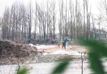 Achter de bomen de loods die aan Wynserdyk 10 staat.