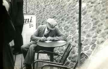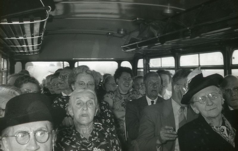 De minsken sitte noch mar krekt yn de bus. Smid Dekker hat in grauwe segaar tusk