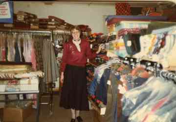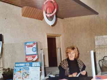 Frou Posthuma yn de winkel oan de Wynserdyk. Dizze winkel mei wenning is boud op