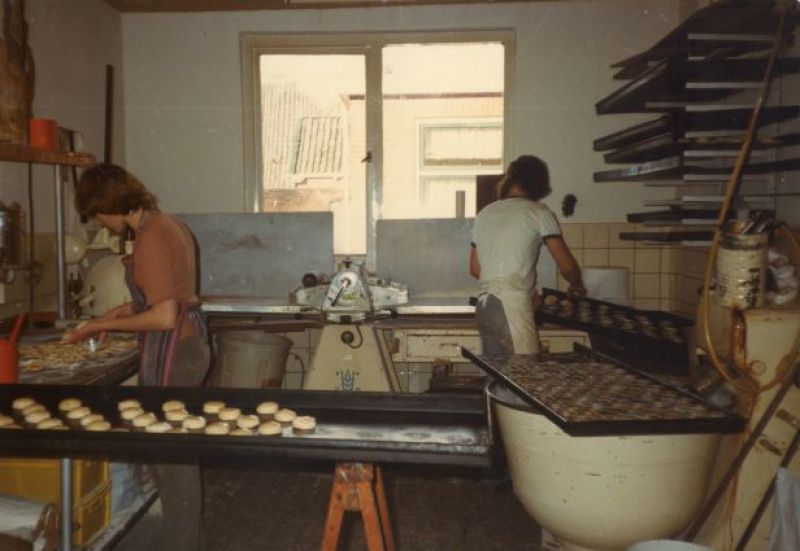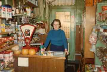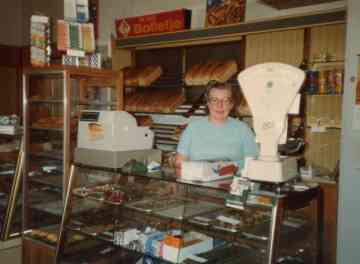 IJbeltje van der Brug efter de toanbank. De winkel mei eigen bakkerij stie oan d