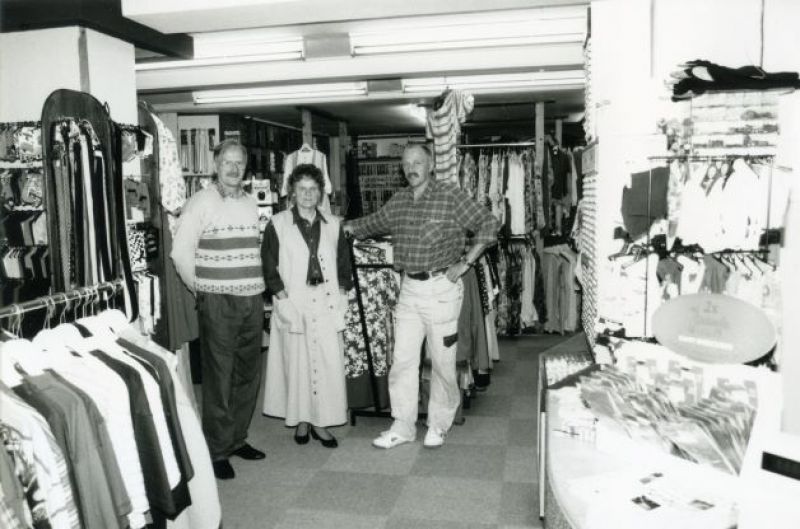 f.l.n.r Arie Bergstra, Aaltje Bergstra-Ruiter en Theo Bergstra Yn de winkel oan