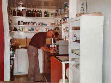Dokter Hemmes oan it wurk yn syn apotheek. Festige oan de Van Eysingaleane.