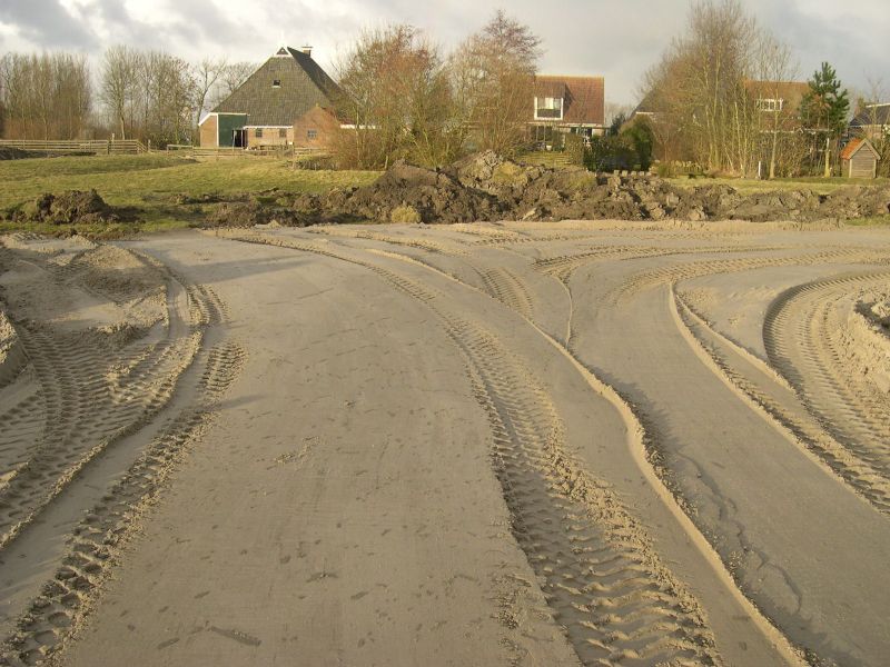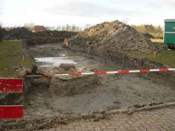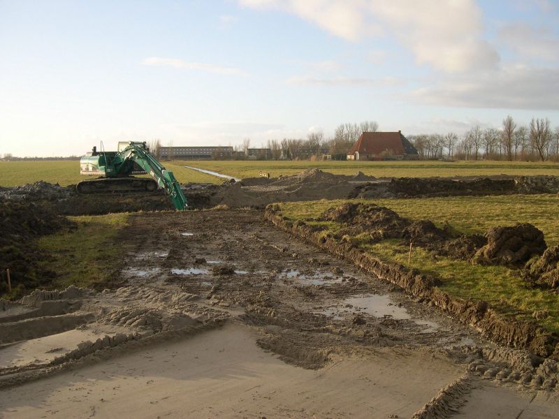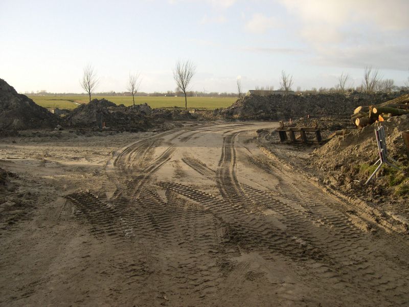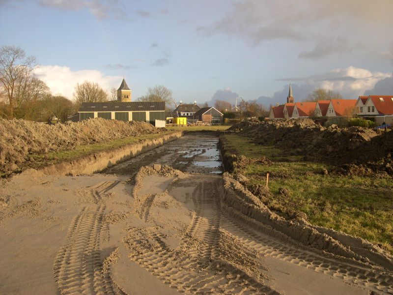 De weg wordt aangelegd. Rechts zie je de huizen aan de Singel staan.