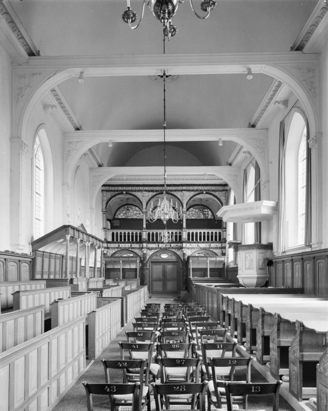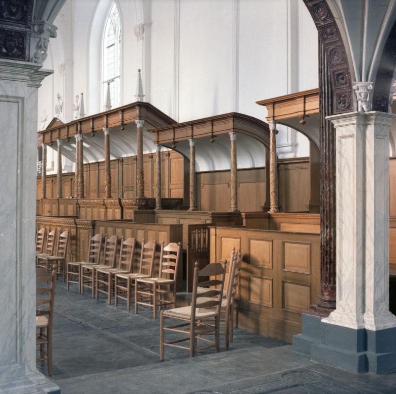 Links ûnder de Notabelenbank. Rjochts oan de muorre it boerd werop de psalmen e