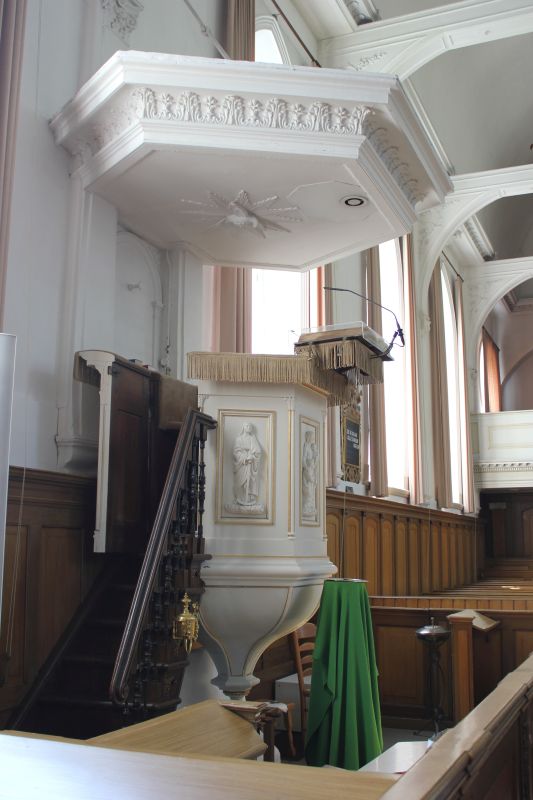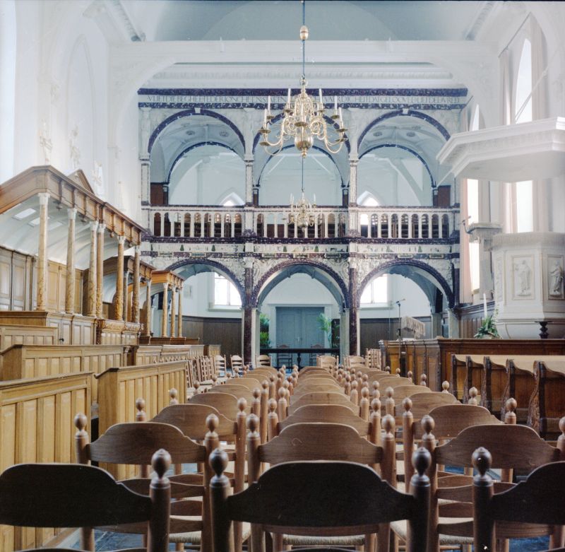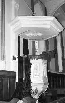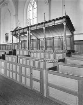 Op de preekstoel leit de âlde iepensleine steatebibel. Oan de preekstoel hinget