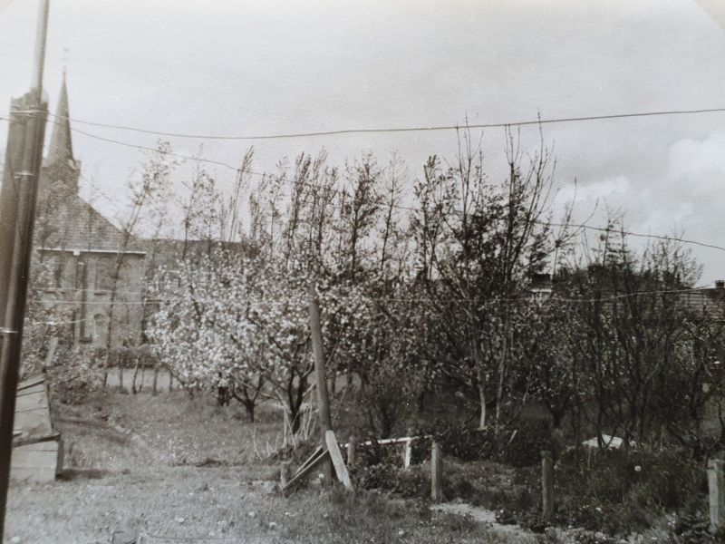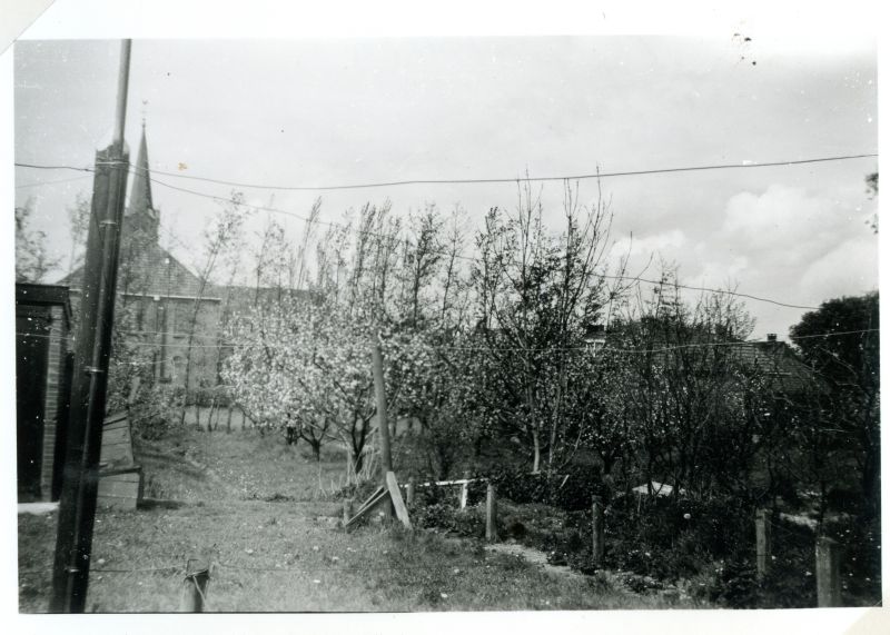 It hôf fan Anne Hingst yn bloei, mei útsjoch op de Grifformearde tsjerke.