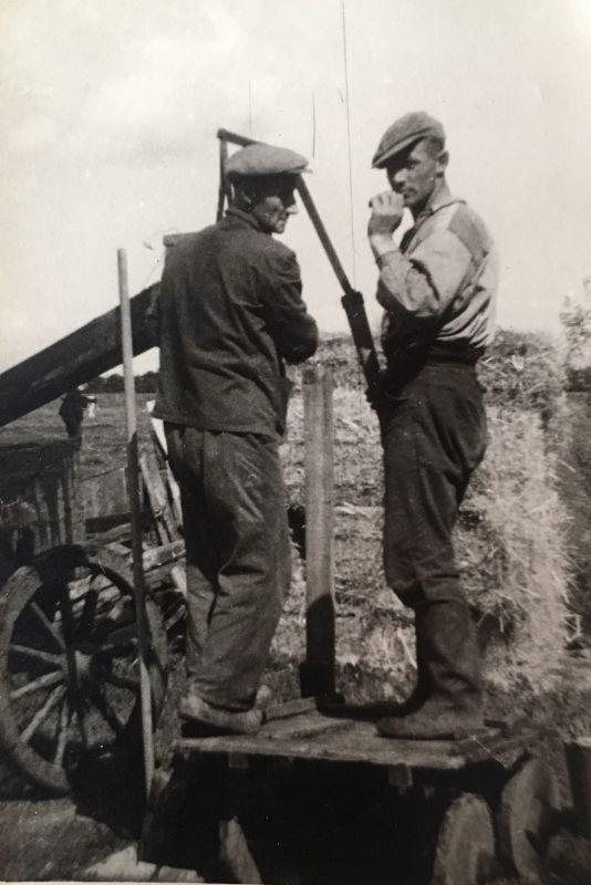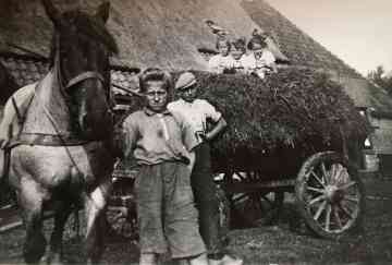 Doede foarop op 'e foto, Tjipke stiet derachter. Op de wein sitte yn it hea v.l