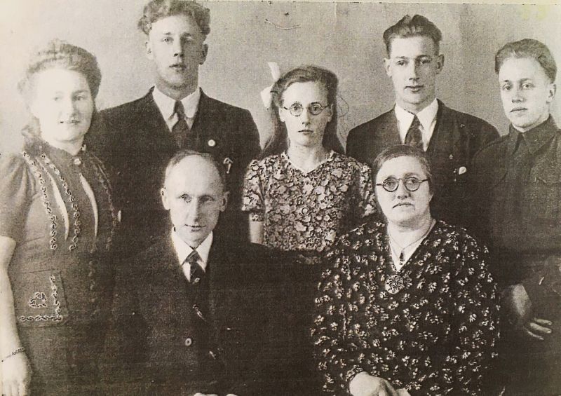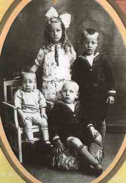 f.l.n.r. steand: Betsy, Durk, Tine, Tjipke en Doede. Foar harren âlden Tjerk Tj
